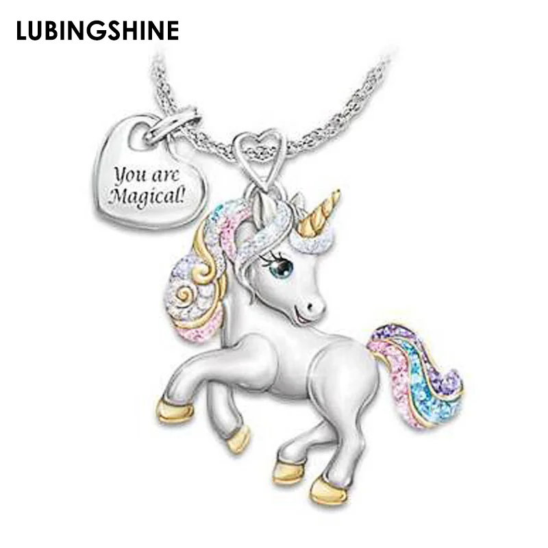 Name: Colgante con forma de corazón de unicornio y diamantes de imitación para mujer, collar de Animal de poni, regalo de joyería
